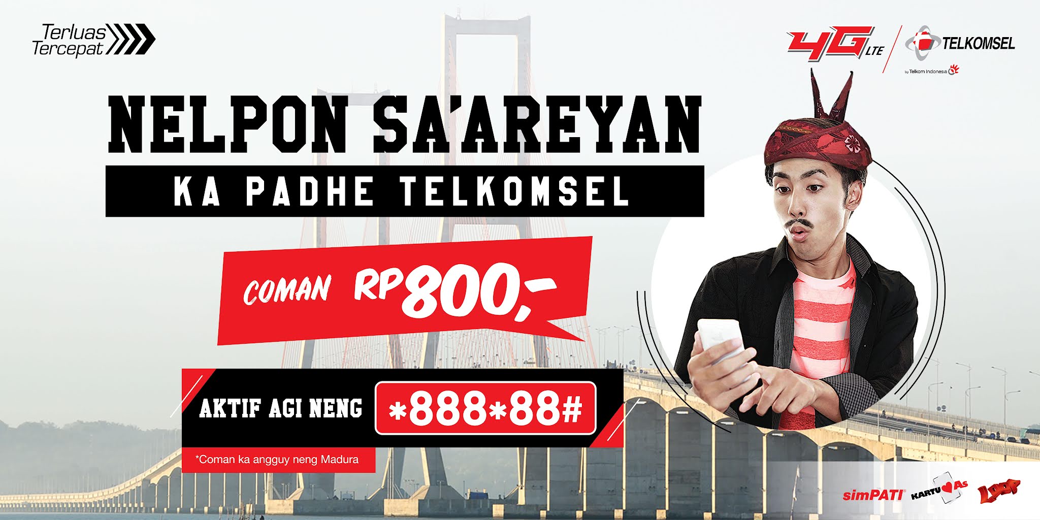 Nikmati telepon tanpa batas setiap hari ke sesama Telkomsel mulai dari Rp800 khusus untuk pelanggan di area Madura, Pantura, dan Lombok.